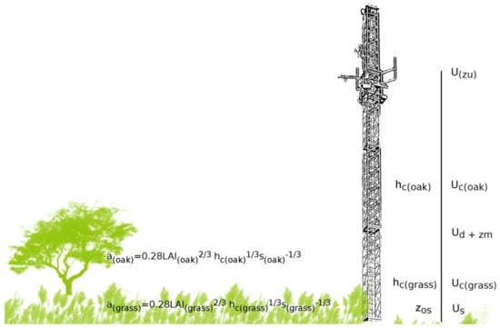 where u(z) is the wind-speed at height z; u(hC) is wind-speed at the canopy; ζ (hC) is a generalization of CdLAI (which accounts for foliage density); Cd is the drag coefficient of the foliage elements (typically ~0.2); a″ is the vertical leaf area density, which, together with Pm, the momentum shelter factor and Cd, takes into account the vertical canopy structure []; is the friction velocity; and kvk is the Von Karman constant.