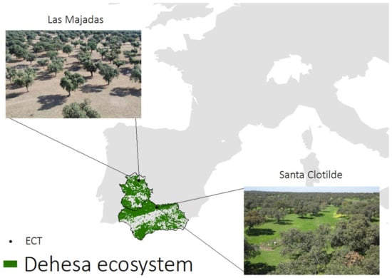 Location of experimental sites, and areas of dehesa ecosystem across Extremadura and Andalusia.