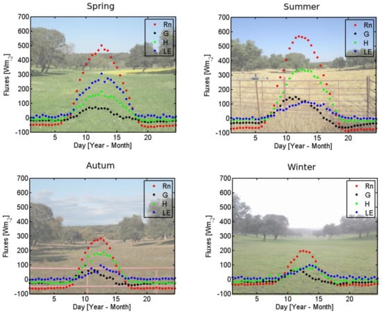 The typical seasonal pattern of flux variation corresponded to that of semiarid Mediterranean areas, with wet-cold and hot-dry periods (Figure 3). In dry periods, H reached maximum value in the middle of the afternoon, while the soil heat flux did so earlier, to reach the minimum after dark. The latent heat increased during the day, but remained low due to the lack of available water in the soil for transpiration or evaporation. In contrast, during wet seasons, LE was higher than H, while G values declined, probably due to the effect of the grass layer, covering the soil and intercepting most incoming radiation. Due to the often lesser importance of the soil heat flux compared to the other components, many studies have simplified the estimated energy balance by discarding this flux on daily scales. However, in savanna type ecosystems, G may represent more than the 20% of the net radiation during summer, similar to or even higher than the latent heat flux, with sensible heat flux reaching values higher than the 45% of Rn. These observations are consistent with the dry summer climatic conditions of the area, during which the water shortage influences strongly the partitioning of available energy between the observed sensible and latent heat fluxes []. During the wet season, the opposite trend is observed.