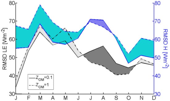 RMSD between estimated and observed values for the energy fluxes of TSEB-GM, TSEB-GR, and TSEB-MR are within the limits found by other authors for more uniform and homogeneous canopies [,,,], and is within the uncertainties of the measurement technique (~40 W m−2). It is worth noting that all the modified wind profile versions that accounted for the existence of different canopy layers with different extinctions coefficients yielded similar results. Both the Massman and Goudriaan models of with-in canopy wind profile yielded reasonable estimates of both fluxes, while Cammalleri et al. [] found for a more uniformly structured/spaced tree crop (olive orchard) a slightly better performance using the Massman model.