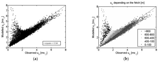 Due to the vegetation characteristics of this ecosystem, Massman’s approach may not yield reliable roughness parameters, and consequently other formulations were also applied, which included [,]. The first approach used the second-order closure model of [] to estimate d0 and z0M. The latter approach of [], considers the tree structure and is more suitable for tall woody vegetation. This method uses observation data to fit the estimation of normalized displaced height and roughness length, related to frontal area index (FAI), which is calculated following Schaudt and Dickinson []. These estimates of z0M and d0 were compared with “observed” d0 and z0M derived from Las Majadas in-situ wind measurements [,]. To calculate d0 and z0M, two wind-speed measurements u1 and u2 (m s−1) at height z1 = 15 and z2 = 9 (m) using cup anemometers, were combined with friction velocity, (m s−1) at zU = 15 (m) from the 3-D sonic anemometer. The 30-min average wind-speeds u1, u2 and sampled at 10 Hz were combined in a set of expressions based on log law for wind in the surface layer for computing d0 and z0M under neutral conditions following Rooney [] and Nakai et al. []: