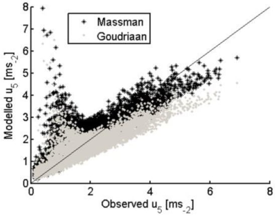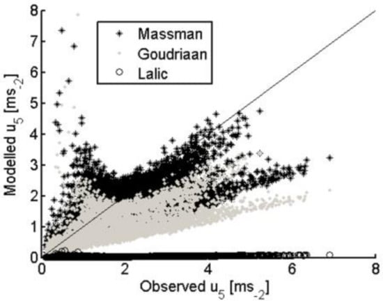 The within-canopy wind-speed profile, using the original exponential formulation of Goudriaan [] and described by Equations (16), (17) and (20), may not be appropriate for forested sites []. Therefore, other within-canopy wind profile parameterizations proposed [,,] were also tested for this ecosystem by comparing the various model computed within-canopy wind-speed at 5 m with the wind-speed measurements at 5 m above local terrain, in the tree canopy air space.