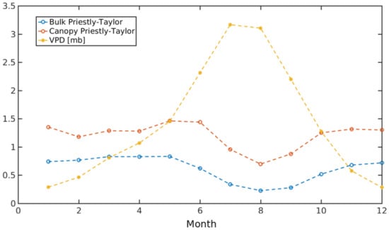 The first assumption needed for computing the turbulent fluxes, the potential canopy transpiration, can have a significant influence on the final estimations []. Priestley–Taylor coefficient (αPT) [] directly conditions this initial transpiration approximation, defined as: