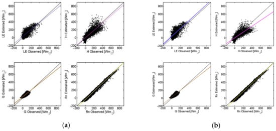 Direct measurements of the four energy balance components were evaluated in both study areas, yielding average closures of 80% for Santa Clotilde and 86% for Las Majadas, both within the error range found by other authors [,]. These quantities represented absolute errors of 49 W m−2 and 40 W m−2, respectively. Better ECB was observed during the summer and winter times. In Santa Clotilde, this can be due to less noise derived from rainfall events and condensation processes occurred during these periods. Lower values of LE were seen to be directly correlated with better closure balance, which, with this flux being very low during dry periods, could indicate higher uncertainty in LE measurement than in H. This is consistent with the Las Majadas analysis done by Perez et al. []. LE has two peaks, in the spring and autumn, related to the typical rainfall temporal distribution. However, the magnitude and timing of precipitations can vary significantly from year to year.