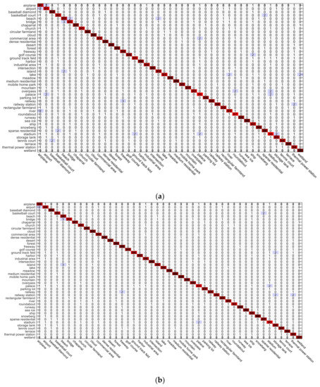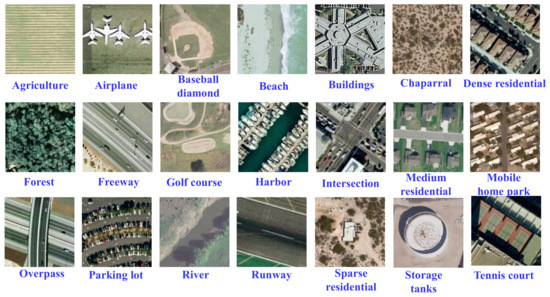 The NWPU-RESISC45 dataset (http://www.escience.cn/people/JunweiHan/NWPU-RESISC45.html) was acquired from Google Earth (Google Inc.), covering more than 100 countries and regions all over the world, including developing, transitional, and highly developed economies [26]. The NWPU-RESISC45 dataset consists of 31,500 remote sensing images divided into 45 scene classes, namely, airplane, airport, baseball diamond, basketball court, beach, bridge, chaparral, church, circular farmland, cloud, commercial area, residential, desert, forest, freeway, golf course, ground track field, harbor, industrial area, intersection, island, lake, meadow, medium residential, mobile home park, mountain, overpass, palace, parking lot, railway, railway station, rectangular farmland, river, roundabout, runway, sea ice, ship, snowberg, sparse residential, stadium, storage tank, tennis court, terrace, thermal power station, and wetland, as shown in Figure 10. Each class separately contains 700 labeled images, which are cropped to pixels. The spatial resolutions for most of the scene classes vary from about 30 m to 0.2 m, except for the island, lake, mountain, and snowberg scene classes, which have lower spatial resolutions.