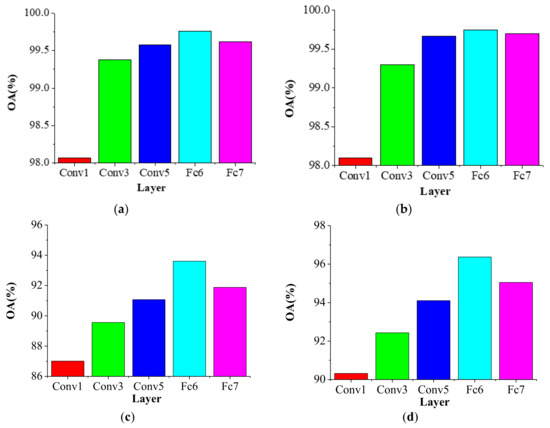 Figure 15. Classification accuracies of the DLGFF framework in relation to the different convolutional layers for the three datasets. (a) UC Merced dataset. (b) Google dataset of SIRI-WHU. (c) NWPU-RESISC45 dataset under the training sample proportion of 10%. (d) NWPU-RESISC45 dataset under the training sample proportion of 20%.
