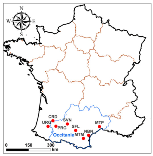 Location of the 7 stations of SMOSMANIA network (Narbonne “NBN”, Mouthoumet “MTM”, Saint-Félix-Lauragais “SFL”, Savenès “SVN”, Peyrusse “PRG”, Creon d’Armagnac “CRD”, Urgons “URG”), and the center of the site located near Montpellier city (MTP, 12 km × 12 km) where additional measurements were obtained. In situ measurements of MTP and NBN were not considered if the corresponding pixel of a SSM product covers the sea water.