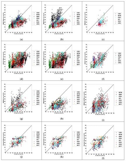 SSM products against in situ SSM. (a) SMAP-36 km (L3_SSM), (b) SMAP-9 km (L3_SSM_E), (c) SMAP/S1-1 km (L2_SSM), (d) ASCAT-25 km (H102 and H103), (e) ASCAT-12.5 km (H101 and H16), (f) ASCAT-1 km (H08), (g) SMOS-IC, (h) SMOS-NRT, (i) SMOS-CATDS, (j) S1-25 km, (k) S1-9 km, (l) S1-1 km.