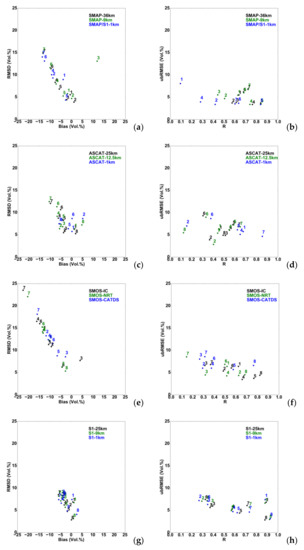 Furthermore, the statistics (bias, RMSD, ubRMSD, and R) for each SSM product are computed using each station alone (Figure 3). S1 products show the lowest bias and RMSD with a bias between −6.0 vol. % and 2.6 vol. % and an RMSD between 2.8 vol. % and 8.5 vol. % (Figure 3g). The estimation of SSM from ASCAT products (bias between −10.5 and 5.1 vol. % and RMSD between 5.2 and 12.5 vol. %, Figure 3c), which are worse than those obtained with S1, are much better than those provided by SMOS and SMAP products. For instance, bias ranges between −13.6 and 11.9 vol. % and RMSD ranges between 3.9 and 15.0 vol. % with SMAP products (Figure 3a), and bias ranges between −22.5 and 4.0 vol. % and RMSD ranges between 5.3 and 23.5 vol. % with SMOS products (Figure 3e).