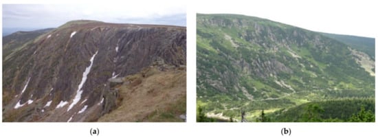 The study area covers the whole high-mountain ecosystem (above 1200 m a.s.l.) of both countries characterised by their diversity of species and communities typical of alpine and subalpine zones (Figure 2) and it covers an area 34.5 km long and 7.6 km wide. The species’ occurrences are mainly determined by geological, climatic, soil and water conditions [36]. The Giant Mountains were formed late in the Alpine orogeny, which was followed by a period of erosion which resulted in rocky-walled postglacial corries (cirques), and characteristic corrie lakes, such as Mały Staw and Wielki Staw. In the ridge areas of the mountains the landscape resembles that of two regions, subarctic and high-mountain, and is referred to as “arctic–alpine tundra” [37]. A local mountain climate has been created here with long, harsh winters, large temperature fluctuations and violent winds [38].