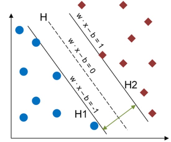 where x is the point on the hyperplane, w is the n-dimensional normal vector for the hyperplane, and b is the distance from the nearest point on the hyperplane to the starting point. Figure 3 shows two sets of points separable linearly. Determination of two hyperplanes H1 and H2 in such a way that there are no points from the set of training data between them, and the distance between them (margin) was as large as possible, can be described by the following equations: