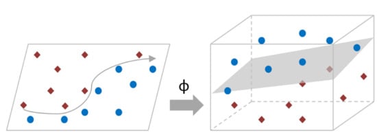 If the feature vectors are not linearly separable they should be mapped into higher dimensional feature space with non-linear vector function , where F is a higher dimensional Euclidean space [52]. Subsequently, the SVM algorithm is used in the new feature space, and the resulting linearly separating hyperplane plane corresponds to the non-linear surface of the original space (Figure 4).