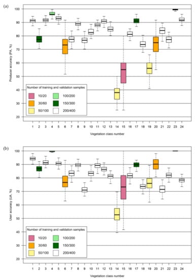 In Figure 6 we also marked number of training and validation samples as colors of boxplots. Generally, high median accuracies (above 85%) and low level of variation (less than 15%) were noted for communities for which collecting a representative number of training and validation pixels (200/400) was possible, as for Carici (rigidae)–Festucetum airoidis in subalpine form, Carici (rigidae)–Nardetum, Rhizocarpion alpicolae, Calamagrostion, Oxycocco–Sphagnetea nigrae, and Molinia caerulea. However, high accuracy did not always go hand in hand with a larger training set; e.g., for Carici (rigidae)–Festucetum airoidis in alpine form represented by 100 training pixels was 96% PA and 100% UA or for Empetro-Vaccinietum, represented by 150 pixels was about 91% PA and 90% UA, while accuracies for Crepido-Calamagrostietum villosae or Vaccinium myrtillus with 200 training pixels oscillated around 75%. Nevertheless, a relationship between the size of the training set and the width of the distribution was noticeable. For Calluna vulgaris and Salicetum lapponum the sets of training and validation pixels (50/100) was too little to achieve high accuracies and their PA values distributions were wide. The Artemisietea vulgaris and Cardamino–Montion classes had very few training (30) and validation pixels (60) resulting in lower PA and higher levels of this accuracy variation. For Adenostyletum alliariae the smallest number of training and validation samples was collected (10 and 20) which caused the widest distribution of both accuracy values.