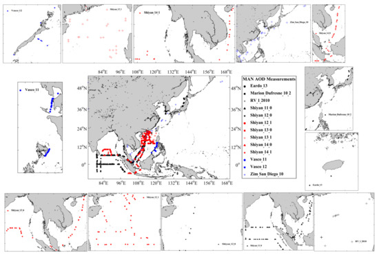 Locations of MAN AOD measurements collected through 13 different cruises, and different colors and symbols represent sampling sites.