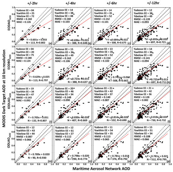 Figure 2 shows the validation of the DT10K EODAOAOD (Figure 2a–d), EODBOAOD (Figure 2e–h), IODLAOAOD (Figure 2i–l), and ODLAOAOD observations (Figure 2m–p) against MAN AOD measurements over the China seas and the eastern Indian Ocean for different time intervals, i.e., within ±2 h (Figure 2a,e,i,m), ±4 h (Figure 2b,f,j,n), ±6 h (Figure 2c,g,k,o), and ±12 h (Figure 2d,h,l,p) of the satellite over pass time. In Figure 2, the red solid line = regression line, the black solid line = 1:1 line, and the dashed lines = EE envelope. The numbers of coincident observation were increased by increasing time intervals as a maximum number of coincident observations were matched for ±12 h and a minimum number of coincident observations were found for ±2 h. For different time intervals, results showed that the retrieved AOD observations were well correlated with the MAN AOD measurements for ±2 h, has small RMSE for ±12 h, and a large percentage of retrievals within the EE for ±4 h. The DT algorithm underestimates AOD for both low (AOD < 0.4) and high (AOD > 0.4) aerosol loadings [36] which might be due to large errors in the estimated surface reflectance and aerosol schemes used in look-up-table (LUT) for aerosol retrievals [43]. The performance of the ODLAAOD retrievals was much better than the other SDS in terms of the agreement with the MAN AOD measurements, a large percentage of retrievals within the EE, and small RMSE. The good agreement indicates that the DT10K AOD retrievals followed the actual variations in aerosol concentrations as measured by MAN AOD [68,69]. Overall, the performance of the DT10K algorithm was not satisfactory in terms of data quality as maximum 61% of the retrievals for ±4 h were within the EE, which is less than one standard deviation confidence interval, i.e., about 66% of points should fall within ±EE from the true AOD, which indicates that the DT10K ocean algorithm does not meet the requirements of the EE over the China seas and the eastern Indian Ocean.