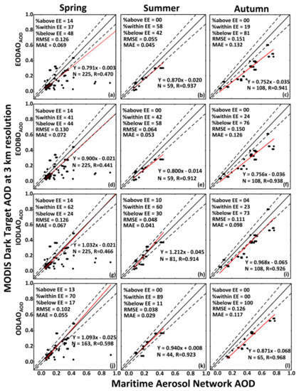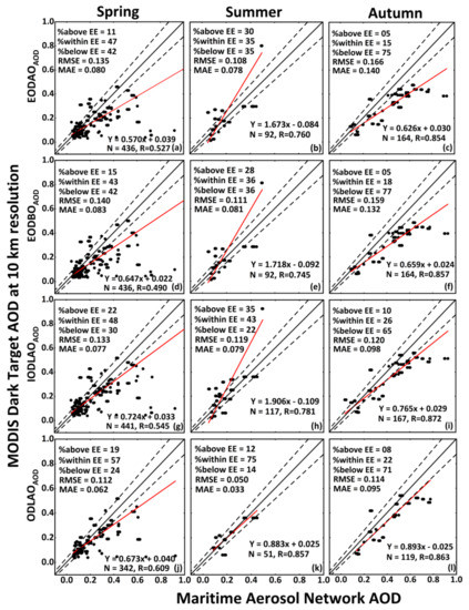 MAN AOD measurements were not available for winter seasons, therefore seasonal validation of the DT10K AOD observations was conducted for spring, summer, and autumn seasons (Figure 3) using AOD observations obtained from four different SDS for ±12 h of the satellite overpass as for this time intervals, DT10K has large numbers of coincident observations. Larger and small numbers of coincident observations were available for spring and summer, respectively. DT AOD was underestimated for high aerosol loadings during spring and autumn, whereas overestimated during summer. This was might be due to the regional meteorology and dust aerosol generation and transport for each season [70]. The quality of the EODAOAOD (Figure 3a–c), EODBOAOD (Figure 3d–f), and IODLAOAOD (Figure 3g–i) retrievals were good in spring than summer and autumn, whereas agreement with MAN AOD was not good. All these of AOD retrievals do not meet the requirements of the EE for each season as the percentage within the EE was less than 66%. Good quality and agreement with MAN AOD were observed for ODLAOAOD observations (Figure 3j–l) in summer as the correlation was 0.856 and 75% of the retrievals were within the EE, although only 51 coincident observations were available.