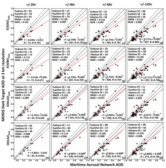 Validation of MODIS DT AOD at 3 km obtained from the SDS Effective_Optical_Depth_Average_Ocean AOD (a–d), Effective_Optical_Depth_Best_Ocean AOD (e–h), Image Optical Depth Land And Ocean (i–l), and Optical Depth Land And Ocean observations (m–p) against MAN AOD over South China Sea for different time intervals, i.e., ±2 h (a,e,i,m), ±2 h (b,f,j,n), ±6 h (c,g,k,o) and ±12 h (d,h,l,p). The black solid line = 1:1 line, the red solid line = regression line, and the dashed black lines = EE bounds.