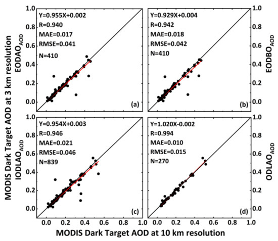 Comparison between MODIS DT3K and DT10K EODAOAOD (a), EODBOAOD (b), IODLAOAOD (c), and ODLAOAOD (d) observations.
