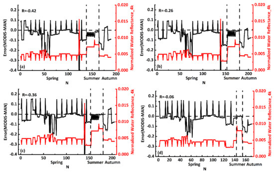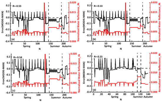 To analyze the errors (MODIS–MAN) in the DT3K and DT10K with respect to seasons over water surfaces, MODIS remote sensing reflectance, which was converted to normalized water reflectance (Rs = Rrs × π), was obtained corresponding to each AOD values. Results show that errors in the DT10K (Figure 7) have a less negative correlation with normalized water reflectance than the errors in the DT3K (Figure 8), especially for EODAOAOD (Figure 7a and Figure 8a), EODBOAOD (Figure 7b and Figure 8b), and IODLAOAOD (Figure 7c and Figure 8c) observations. These results indicate that the DT3K mostly underestimates AOD over turbid waters where normalized water reflectances are high and overestimates AOD over clear water where normalized water reflectances are relatively low compared to the DT10K. For example, significant underestimation was observed in spring for high values of normalized water reflectance, and this was might be due to an error in the estimated surface reflectance used in the DT algorithm [43]. This underestimation in the DT3K AOD retrievals was more prominent because some pixels might be retained in the DT3K which are deselected by the DT10K during threshold criteria [44]. It is worth mentioning that ODLAOAOD (Figure 7d and Figure 8d) has a weak correlation with the normalized water reflectance, and the DT algorithm for this parameter is less sensitive to the water quality and under– and over–estimations do not follow the increasing and decreasing trend of normalized water reflectance. These results showed that the ODLAOAOD observations for the highest quality flag are less sensitive to water types and suitable for accurate aerosol monitoring over the China seas and the eastern Indian Ocean compared to the other parameters.