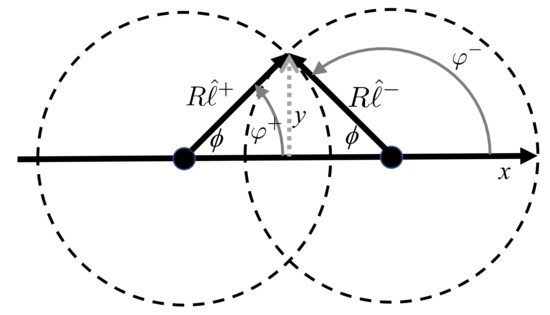 Geometry, viewed from above, for the inversion of vector surface velocities and winds. The platform flies along the x-direction, and the cross-track distance is given by y. For a given range, the footprint scans along a circle of radius R centered at the radar position (indicated by a dark circle). For this simple geometry, any given point in the swath is mapped twice, with a plane-projected look vector in the forward (backward) direction given by (). The angle is the angle between the forward look and platform directions and D is the platform separation. It is related to the backward look angle by .