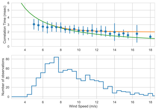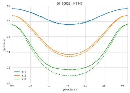 In Figure 6, we compare the estimated noise in the radial velocity (blue), against predictions using Equation (10) with the estimated using either the naïve Cramér–Rao bound () (green), or the version where is estimated from the total correlation time (orange). The estimates of the radial velocity random error (blue) were obtained for each pulse-pair by removing a trend in range for the radial velocity and computing the standard deviation of the resulting signal: this is a conservative estimate since there will be some natural variability due to waves and currents. Since the ocean surface correlation time is unknown a priori, we estimate the and by fitting a quadratic in time for multiple pulse separations to the logarithm of the correlation function and averaging the estimates for each range line for the same samples used to estimate the random error (additional results regarding the temporal correlation function are given in Section 3.1). Both measured and predicted random errors show periodic variations with azimuth due to changes predicted by the Doppler correlation in Equation (6), with minimum errors occurring in the fore and aft directions, and maxima at broadside. The figure shows that the naïve estimator underestimates the observed error significantly, while the Cramér–Rao bound with determined by the correlation time is in good agreement with the observations. The fact that the naïve estimator underestimates the error significantly explains the degraded performance when multiple pulses are used in combination using Equation (9): the estimation weights are too large for the larger pulse-pair separations, resulting in the introduction of additional noise. One can improve the multi-pulse estimator in Equation (9) by using the predicted variances, which incorporate the effective number of looks into the weights, , but we have found that this modification has only a small effect on the estimation, due to the larger errors for greater pulse-pair separation. At this point, we do not have a simple explanation as to why the MLE estimator performs so poorly against the pulse-pair interferogram phase.