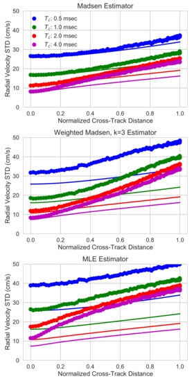 Performance of three pulse-pair estimators described in the text as a function of , the cross-track distance divided by the swath radius. Solid lines correspond to the Cramér–Rao bound given by Equation (A47). Circles correspond to the simulation results as a function of correlation time for of 0.5 ms (blue), 1.0 ms (green), 2.0 ms (red), and 4.0 ms (purple).