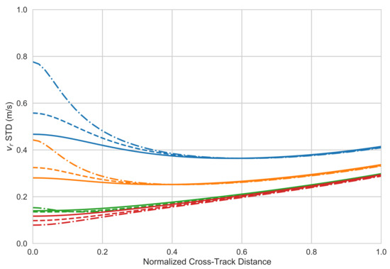 Random component of the radial velocity for Signal-to-Noise Ratios (SNRs) of 5 dB (blue), 10 dB (orange), 20 dB (green) and 30 dB (red) and radial velocity standard deviations (0.2 m/s (solid), 0.4 m/s (dashed), and 0.6 m/s (dot-dashed) for a platform velocity of 130 m/s and assuming that and ms. The cross-track distance is divided by the distance from the nadir track to the outer swath.