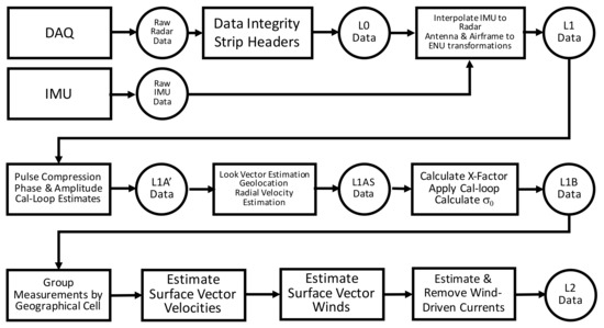 Figure 7 presents an overview of the DopplerScatt data processing, which, following the usual NASA conventions, produces data at three different levels: Level-0 (L0) data transformed from a raw digital subsystem (DAQ) and IMU data into quality-assessed engineering radar and IMU data in physical units; Level-1 (L1) data produces geolocated estimates of and residual radial velocity, after subtracting platform motion effects, obtained by combining 100 transmit pulses; Level-2 (L2) data contains geolocated estimates for surface vector winds and currents sampled along individual observations swaths. Level-3 gridded data is obtained by combining multiple swaths and requires accounting for temporal differences between different swaths, which typically requires some assumption about dynamics, and is not an official product at this point given uncertainties in the dynamics at DopplerScatt resolution scales. Below, we describe the general interest L1 and L2 processing algorithms, as L0 processing is hardware specific.