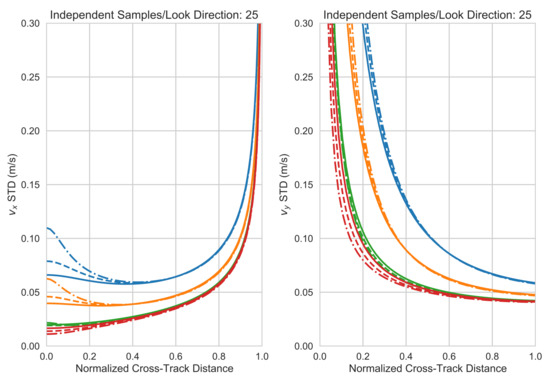 These equations show that the surface velocity errors are a function of cross-track distance, y, but not of the along-track coordinate, x, with unbounded errors at the nadir and far swath. They also indicate that we can expect the along-track error to be large at the edges of the swath, while the cross-track errors will grow in the nadir direction. Finally, they show that, if the radial velocity errors are symmetric with respect to look direction (i.e., ), then the along-track velocity errors cancel, whereas, if they are antisymmetric (i.e., ), the cross-track errors cancel.
