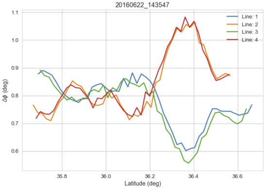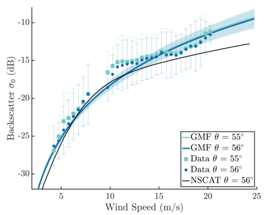 where is the Bragg wavenumber, the radar wavenumber, and is the directional saturation (or curvature) spectrum [32,65] when is directional wave height spectrum. The total cross section is , where is the folded saturation spectrum used in [29,32]. The Bragg wavenumber changes little with small changes in the incidence angle, and we assume that the saturation spectrum can be evaluated at the nominal incidence angle, and its angular variation included into the A term as a linear term. If the surface elevation is given by , to first order in the surface slope, one will have that and, assuming that the large-scale waves have a narrow spectral distribution and they travel along the x-direction, we can neglect the slope in the orthogonal direction, .