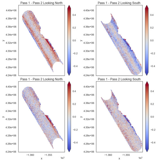 where, as shown in Figure 1, is the relative angle between the platform velocity and the look direction. Since , one will have as long as the azimuth error remains constant between fore and aft observations. Replacing this in Equations (26) and (27), one sees that a constant azimuth bias will affect the cross-track surface current, but will have little impact on the along-track component. An error in the along-track component due to a constant azimuth bias will introduce a constant cross-track bias