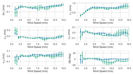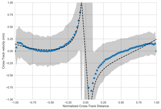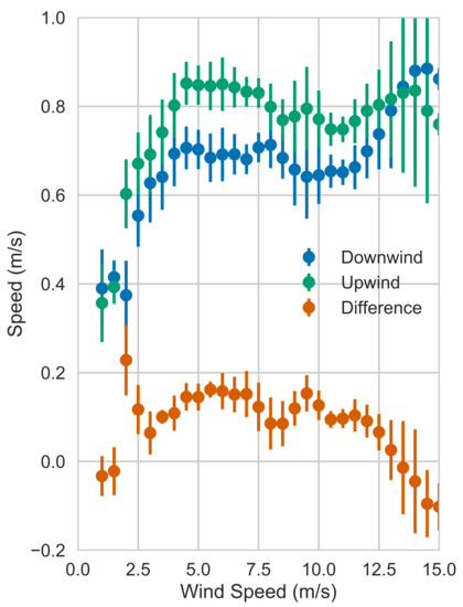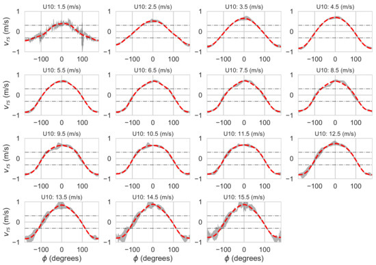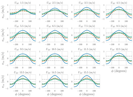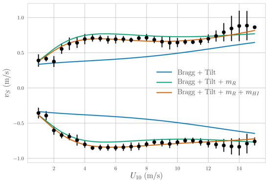 The presence of the factor multiplying the parenthesis in Equation (A64) indicates that the terms in the parenthesis will behave as a horizontal current and result in a bias that is equal in magnitude but opposite in sign in the upwind and downwind directions. On the other hand, the last term in Equation (A64) is independent of the azimuth direction, and behaves as a net vertical velocity term, which does not disappear when performing weighted averaging over the long wave. Since this term is the only one that does not change sign when as the look direction changes from upwind to downwind, it is responsible for the upwind/downwind difference in . The upwind radial velocity magnitude will be greater than the downwind component (as in Figure 28) if ; i.e., if the saturation spectrum increases in the leeward side of the wave (). If , as can happen due to wave breaking roughness in the windward part of the wave [58], the downwind velocity magnitude will be greater. The difference in magnitudes will be given by .