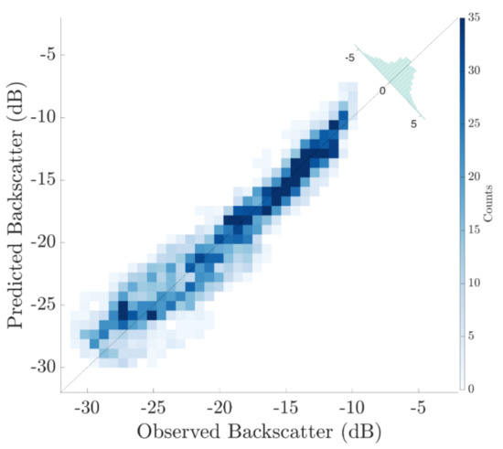 In this appendix, we derive the expected joint behavior of and measured radial velocity following and approach similar to [8,19,23,32,58], but without making any explicit assumption regarding the spectral and wind dependence of the modulation coefficients. We assume that two-scale Bragg scattering dominates for V-pol, for a patch tilted such that the local incidence angle is given by , where is due to the long waves. This model can accommodate the effects of wave breaking, as long as it is not caused by scattering through double-bounce wedge scattering, but through an increase in surface roughness; this effect of breaking waves has recently been observed experimentally by Yurovsky et al. [58], where they show that the effects breaking events do not generally propagate with the speed of the breaking wave facet, but at a lower speed. It can also accommodate bound waves, as described below.