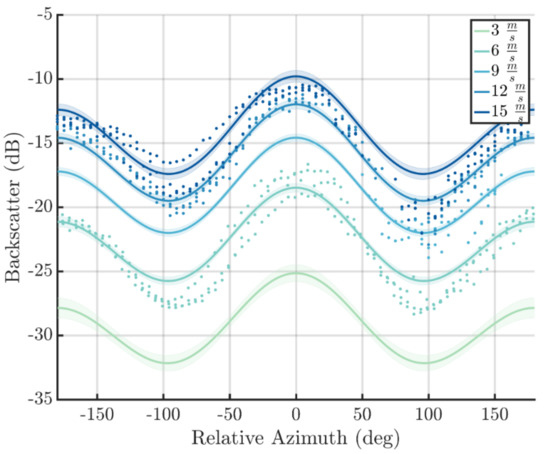 The first term, , represents the correlation between and fluctuations within the resolution cell, reflecting the modulation of the resolution cell Doppler centroid by changes in . Thus, if velocity and backscatter modulations are correlated (by hydrodynamic, tilt, or other modulations), the radial velocity contributing to the Doppler will not be , but will be shifted towards the velocities in the brighter parts of the long waves and may cause a net Doppler shift even when the average wave orbital velocity is negligible. The presence of this coupling has been known for a while (e.g., [17,18]), while Chapron et al. [8] called attention to the strong wind dependence for moderate incidence angles at C-band. The coupling has been incorporated subsequently into the DopRIM model [19,20,21] for estimating the wind-wave component of the radial velocity. This type of modulation has been shown to be important at C-band [8,20] and X-band [22], and to introduce a significant wind component that is a function of both wind speed and direction, with theory being in general good agreement with observations. At Ka-band, there is a much smaller literature, although recently Yurovsky and colleagues [23,24] have shown empirical and theoretical evidence for a wind induced component, which will be discussed in greater detail below.