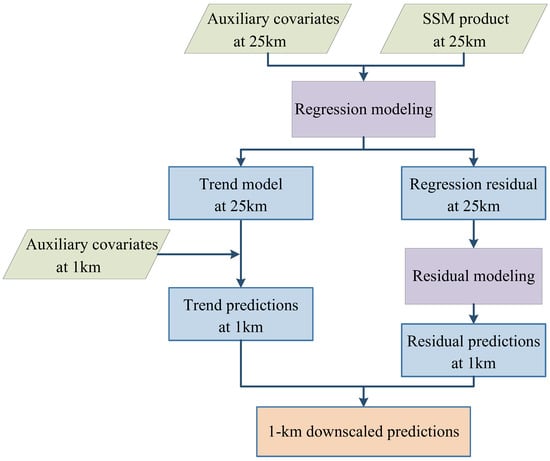 The two experimental regions in China, adopted to make the evaluation results more reliable, comprised the upper HRB area and the Naqu area, Tibet (Figure 1). Processing of all data is an essential step prior to the implementation of any downscaling method and validation. Under the same grid system, 25 km-resolution coarse SSM data and 25 km-resolution and 1 km-resolution related variables were preprocessed using resampling or average aggregation, as well as kriging interpolation, to fill gaps and compensate for non-full coverage. Figure 4 displays the simplified flowchart of downscaling method, which the downscaled perditions are consisted of trend and residual components. And Table 2 presents the details of the two study areas and the downscaling strategies adopted in this research.