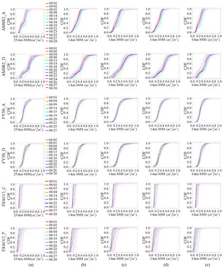 CDF curves for various remotely sensed products on available days within one month in the upstream HBR area: (a) coarse 25 km SSM products and downscaled 1 km SSM predictions derived using the four methods: (b) GWATPRK, (c) QRM, (d) ATPRK, and (e) SVR.