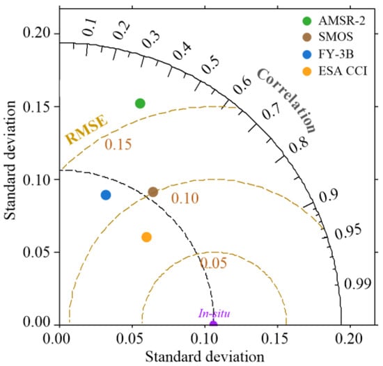 Simple Taylor diagram displaying statistical comparisons between 1 km SSM downscaled predictions combining two cases and ground-based measurements for AMSR-2, SMOS, FY-3B, and ESA CCI. The in situ point is for all the validation data.