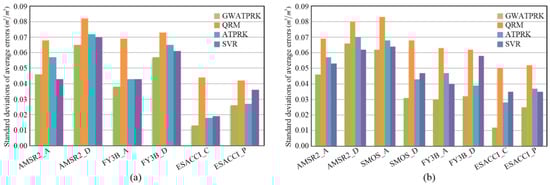 Standard deviations of average errors of 1 km predictions from different coarse SSM products in two experimental regions: (a) upper HBR area and (b) Naqu area.