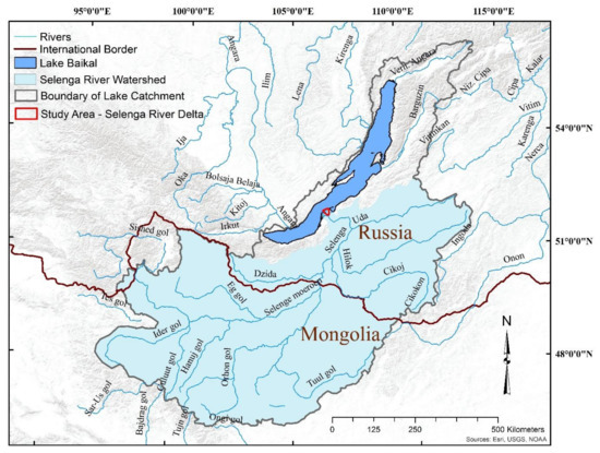 The watershed contributing to the study area, the Selenga River Delta into Lake Baikal, Russia.