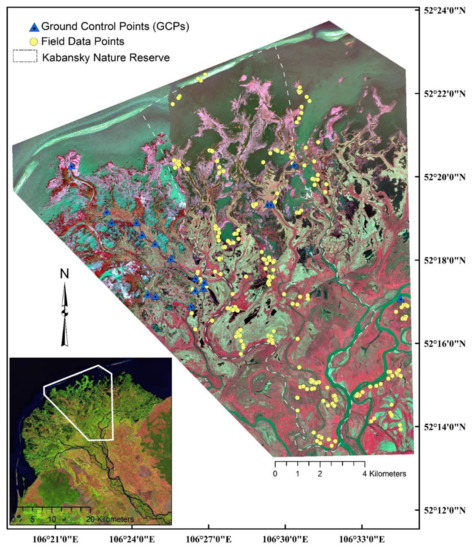 WorldView-2 false-color composite (near infrared-1 (NIR1), red, green) of the study area showing the spatial location of the field-sampling locations and ground control points. Inset image shows the Selenga River Delta in Lake Baikal and the study area boundary.