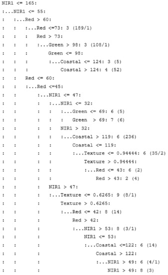 The DT was constructed in two steps. First, a large tree was grown to fit the training data closely. Then, the tree was pruned (or winnowed) to remove attributes that affected the error rate. This pruning process attempted to correct overfitting errors and reduce the tree size [36,83,87]. DT and RB models were boosted in Tests 10, 12, 14, and 16, wherein the misclassified leaves in the final DT were reanalyzed and the model was reiteratively run in an attempt to properly classify these errors. Boosting was conducted for 10 trials or until the model performance failed to improve as measured by the error rate. The portion of the DT from the 5-layer stack (WV2 coastal, green, red, and NIR1 bands plus texture) is displayed as a branching dichotomous tree in Figure 3.
