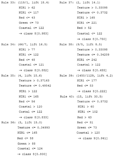 The DT developed in 2.7.2 (including the boosting conducted in Tests 10, 12, 14, and 16) was transformed into a simpler set of “if-then” rules in C5.0 by creating “rulesets” in the algorithm. The ruleset generated from the DT has fewer rules than the number of leaves in the decision tree, thus it is a more compact and simpler representation [88]. Since each conditional logic rule describes a specific context associated with a class, it is relatively easy to examine, validate, and interpret the ruleset. The “if-then” logic rules make the connection between wetland classes and their predictor variables. A portion of the ruleset when using the same five-layer stack as in Figure 3 is shown in Figure 4.
