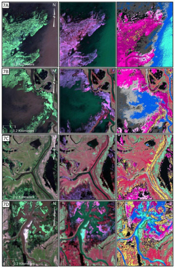 We conducted a preliminary ISODATA classification to inform our field study in 2011, initially selecting 24 classes with sufficiently high Jeffries-Matusita (J-M) separability values [68]. After the field expedition in 2011, we conducted a maximum likelihood classification to inform the 2012 field expedition, merging some classes to create a 22-class wetland landscape, as detailed in Lane et al. [60,61].