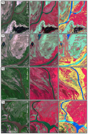 (A–H). The vegetation of the Selenga River Delta follows a north-to-south and wetter-to-drier gradient, as evidenced by the abundance of different wetland classes within the white rectangles in Figure 6. The images are combined WV2 bands 532 (left), bands 753 (middle), and the wetland classification thematic map (right) using the legend in Figure 6.