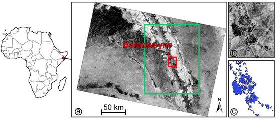 The test area is situated in the arid climate zone of Somalia and Ethiopia and covers the central Hiran region, with Beledweyne as the capital city. The Shabelle River, which emerges on the eastern Ethiopian highlands at an altitude of about 4230 m above sea level and then flows in a southeastern direction into Somalia towards Mogadishu, traverses the study site. Usually, Shabelle River is of enormous economic importance due to agricultural reasons. However, it is frequently threatened by inundations that destroy crops, livestock, and homes, cause deaths, and generally affect thousands of people [22,23]. The focus of this study is the flooding in 2016. This disaster event started on 15 May and continued until the beginning of June. It affected more than 30,000 people, destroying crops and fields, and forcing several thousands of people to flee [24]. The methodology was tested on a Sentinel-1 target scene of 30 May 2016 (Figure 1) which covers flooding along the Shabelle River. Large parts of the area of interest are covered by sand, which has nearly the same backscatter as open flood surfaces.