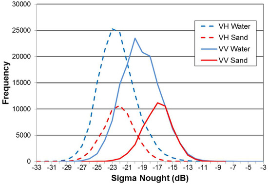 The parameter τ is empirically defined as −15 dB in this study, as below this value there is a large overlap between the probability density functions of the classes for water and sand areas (Figure 3) and it includes most sand surfaces leading to a misclassification of the water surfaces. Further, best results have been achieved in using this value in computing the SEL.