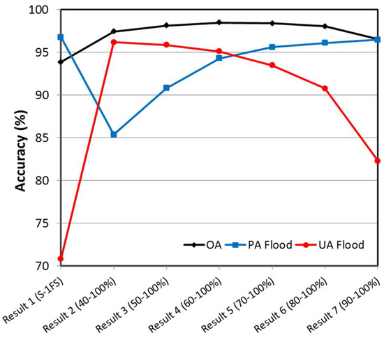 Overall (OA), User’s (UA), and Producer’s Accuracies (PA) of the flood masks produced by the Sentinel-1 Flood Service and of the improvements using SEL60–100% computed with different time-series lengths.