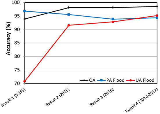 The SEL based on the three years’ time-series with 202 data sets (OA 06/2014–05/2017: 98.5%) led to better classification results than the SELs based on data of only one year from 2015 (OA: 98.1%, 55 data) and 2016 (OA 2016: 98.1%, 65 data). However, as the difference in accuracy between the three years’ time-series and both of the one-year time-series was very low (0.4%) this slight improvement has to be weighed against the higher computational demand. Due to computational reasons, the SEL can be processed offline for a certain time period over the required arid areas in order to improve the NRT applicability of the automatic flood processing chain during disaster management activities by removing sand-related water look-alike areas.