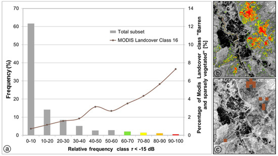 (a) Distribution of pixel frequencies of SEL60–100% vs. MODIS Landcover (MCD12Q1) Class 16 (“Barren or sparsely vegetated”); (b) frequency classes 60–100% used for computing SEL60–100%; (c) MODIS Landcover Class 16.