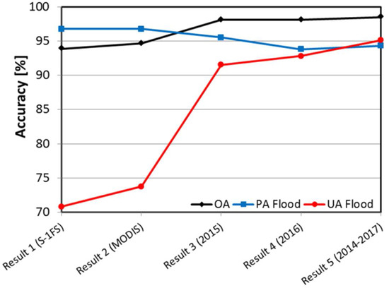 Overall (OA), User’s (UA), and Producer’s Accuracies (PA) of the flood masks produced by the Sentinel-1 Flood Service and of the improvements using the MODIS Landcover Class 16 and the SEL60–100% computed with different time-series lengths.